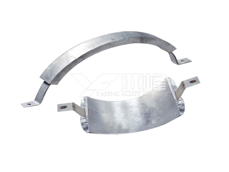 常用的鋁合金陽極有Al-Zn-In系和Al-Zn-Hg系陽極,適用于海水中的船舶、碼頭港口與海洋設(shè)施、海水冷卻水系統(tǒng)和儲罐沉積水部位等構(gòu)筑物的陰極保護。鋁鋅銦系(AZI系)犧牲陽極是用高純度鋁及鋅、銦等金屬合金化而鑄成的。鋁合金陽極生產(chǎn)執(zhí)行GB/T4948-2002《鋁-鋅-銦系合金犧牲陽極》。