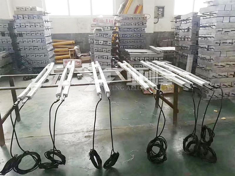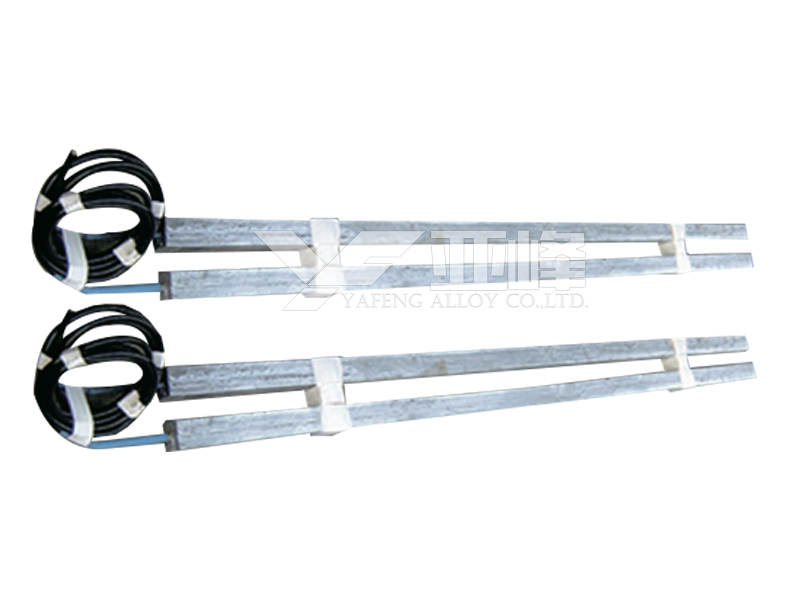 鋅接地電池由平行靠近的一對(duì)或四支鋅合金犧牲陽極棒組成,中間用絕緣墊塊隔開,然后一起裝在裝有填包料的棉布袋中,通過引出電纜焊接在絕緣裝置(絕緣接頭或法蘭)的兩側(cè),以防止強(qiáng)電沖擊引起的損壞,同時(shí)日常情況下接地電池也可對(duì)管道起保護(hù)作用。