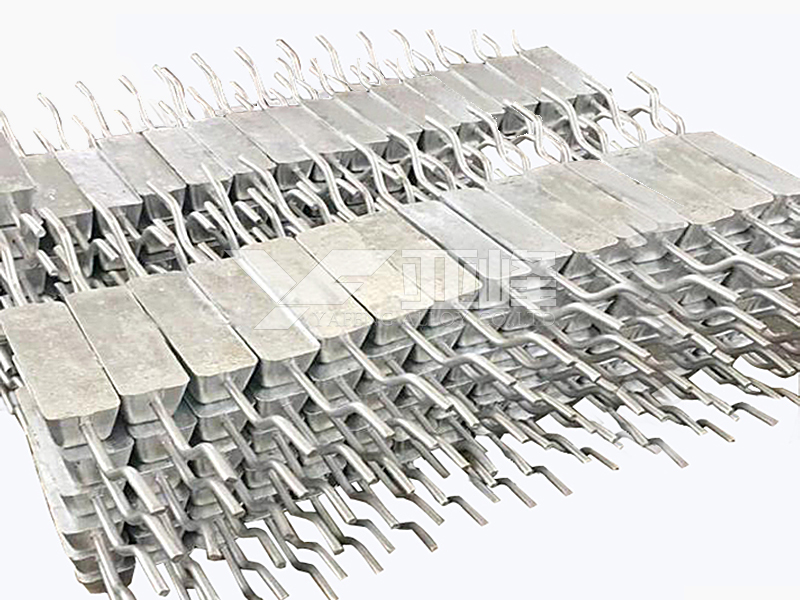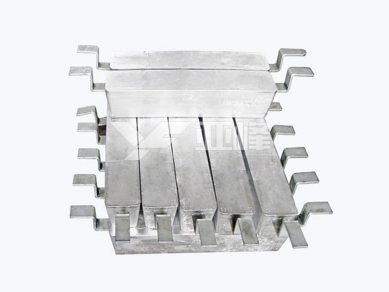 常用的鋁合金陽極有Al-Zn-In系和Al-Zn-Hg系陽極,適用于海水中的船舶、碼頭港口與海洋設(shè)施、海水冷卻水系統(tǒng)和儲罐沉積水部位等構(gòu)筑物的陰極保護。鋁鋅銦系(AZI系)犧牲陽極是用高純度鋁及鋅、銦等金屬合金化而鑄成的。鋁合金陽極生產(chǎn)執(zhí)行GB/T4948-2002《鋁-鋅-銦系合金犧牲陽極》。